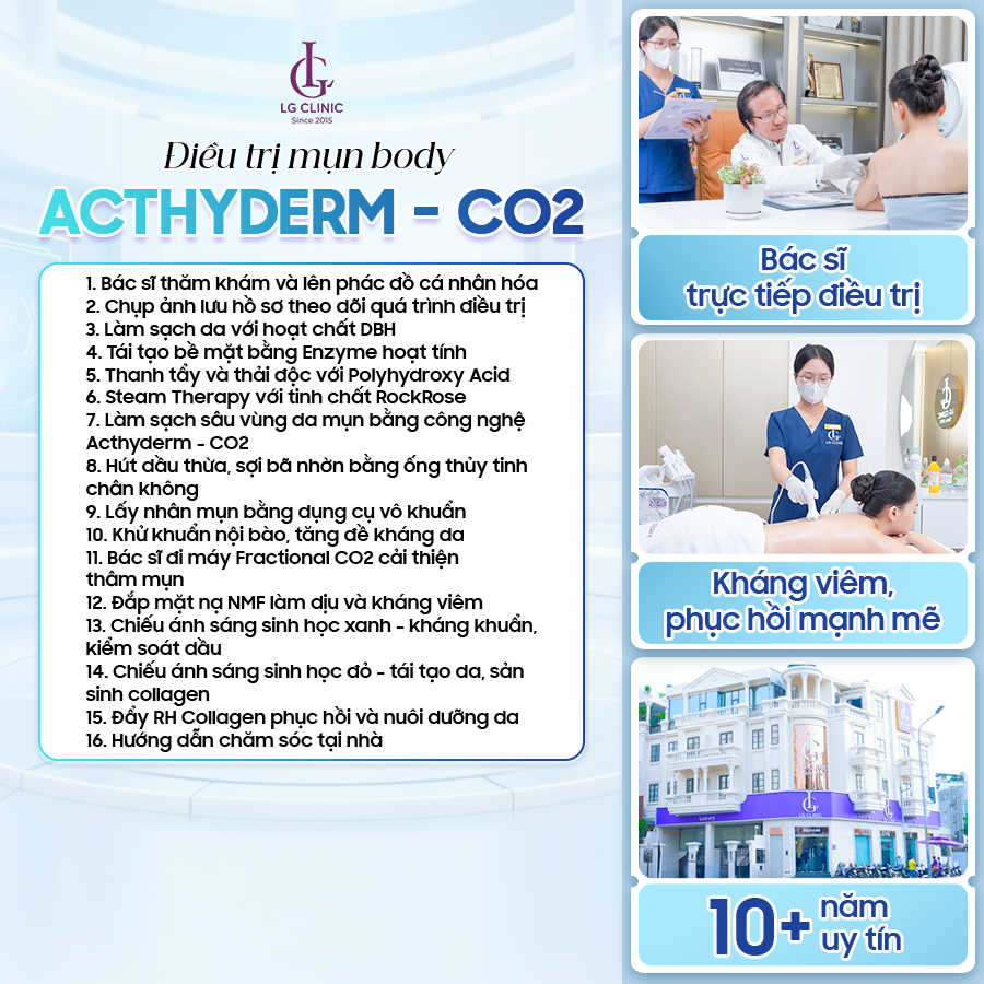 Với cơ chế điều trị khoa học, an toàn và không xâm lấn, công nghệ Acthyderm – CO2 tại LG Clinic đã giúp hàng nghìn khách hàng loại bỏ mụn, phục hồi da khỏe mạnh và ngăn ngừa tình trạng tái phát. Nếu bạn đang gặp vấn đề về mụn body dai dẳng, đây là thời điểm thích hợp để tìm đến một phương pháp điều trị chuẩn y khoa, an toàn và mang lại hiệu quả bền vững. Hãy tham khảo công nghệ Acthyderm – CO2 tại LG Clinic và tìm lại làn da khỏe mạnh, sạch mụn ngay hôm nay!