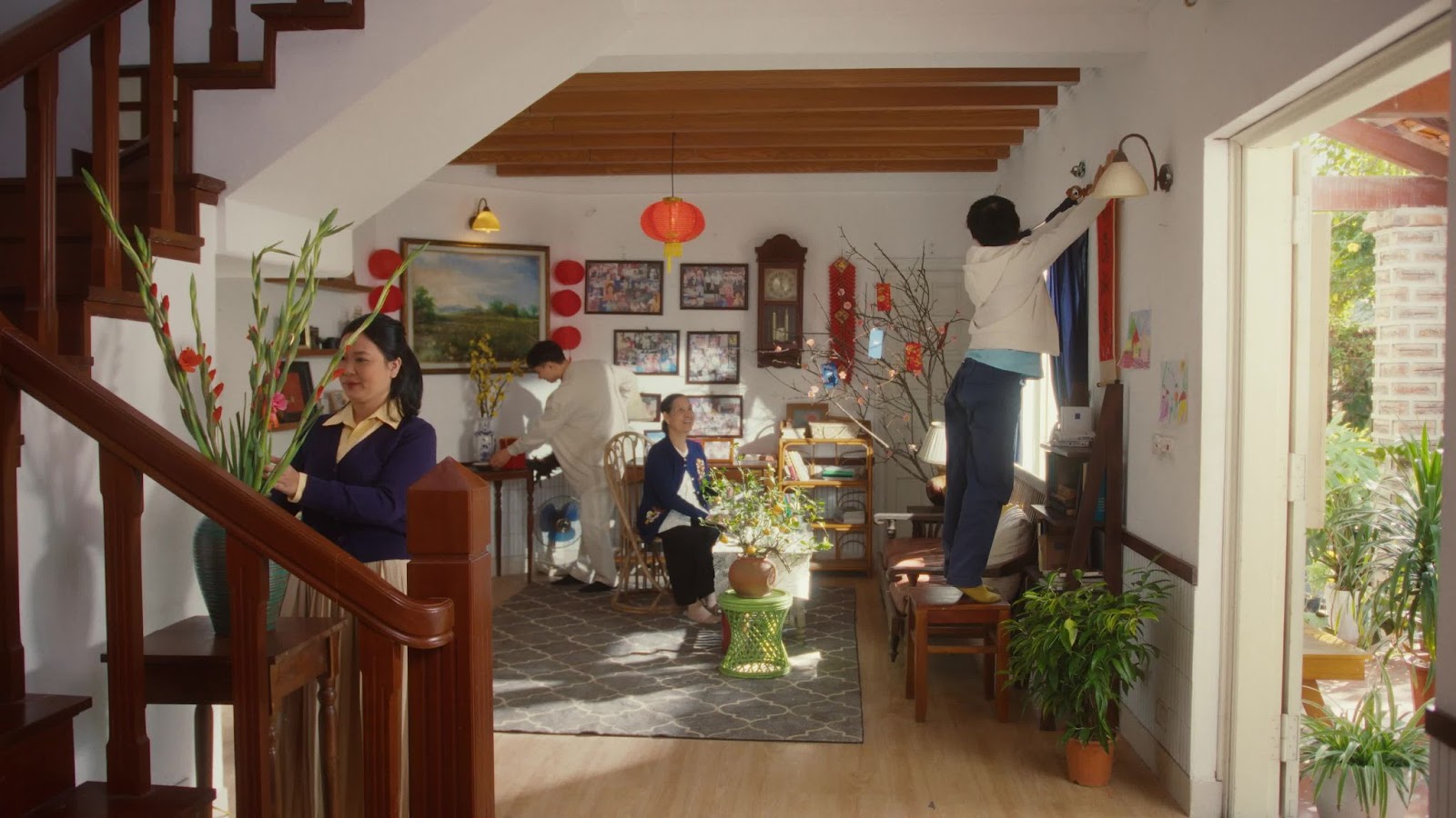 Khi khung hình chuyển dần sang những hoạt động của gia đình, từng khoảnh khắc thân thuộc hiện lên như một thước phim tua chậm: cậu cháu trai từng chạy nhảy líu lo bên bà giờ đây đã chững chạc hơn, biết giúp mẹ dọn dẹp nhà cửa. Những hình ảnh ấy không chỉ tái hiện không khí Tết ấm áp mà còn khắc họa hành trình trưởng thành của con cháu trong gia đình – một hành trình mang lại niềm hạnh phúc, nhưng cũng nhắc nhớ sự đổi thay không thể tránh khỏi của thời gian.